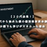 - 【20代必見!】20代から始めた僕の個別株投資体験談|少額でも学びが大きかった理由目次 はじめに僕が個別株投資を始めた理由値動きによる損益・利益を体験してみたかった世の中の企業に詳しくなりたか… 続きを読む: 【20代必見!】20代から始めた僕の個別株投資体験談|少額でも学びが大きかった理由