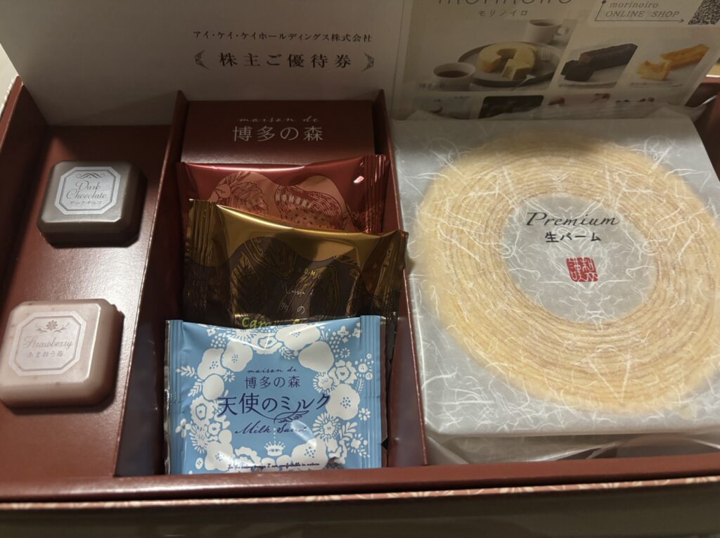 IKKの優待は、1年以上継続保有の株主が対象(2026年4月末より)で、保有株数に応じて特選お菓子やギフト、そしてレストランのお食事優待券がもらえます。