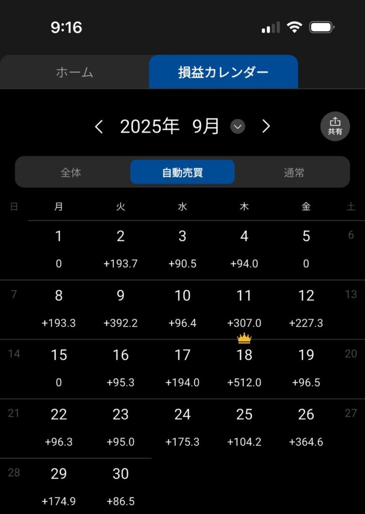 9月は設定もいじらず見守るだけでしたが取引のなかった日は5日と15日の2日のみでかなり良い実績となりました✨