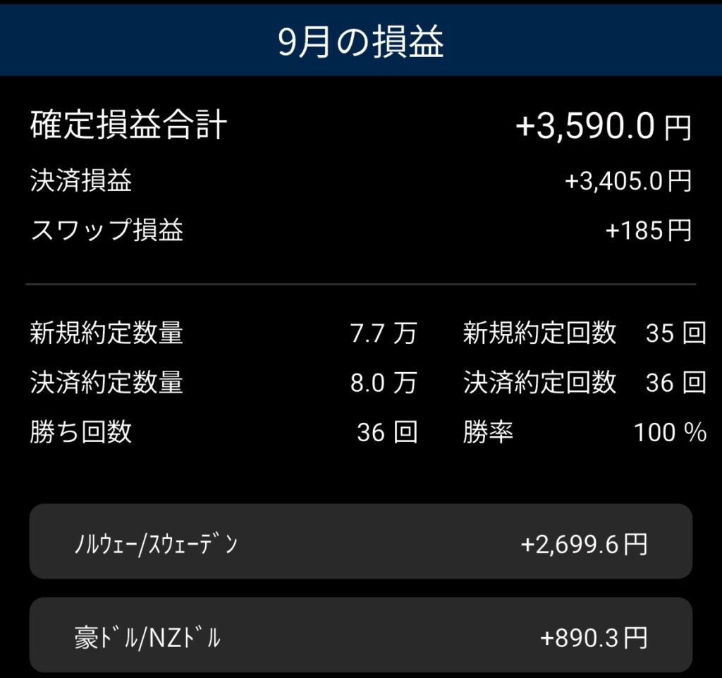 9月は過去最高となる+3,590円の収益を達成しました。